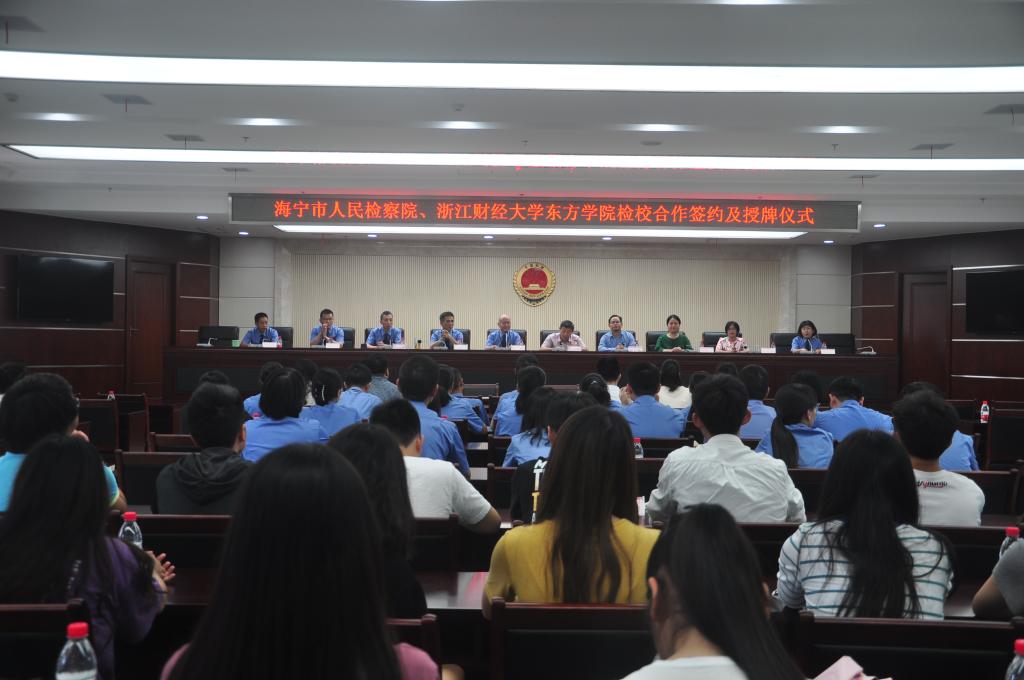 5月24日上午,海宁市人民检察院、浙江财经大学东方学院检校全面战略合作签约仪式在海宁市人民检察院举行,双方共建的“司法社会工作教学科研基地”和“检察工作创新实践基地”同时揭牌。海宁市人民检察院党组书记、检察长李斌,学院副院长王记清,海宁市人民检察院中层及以上干警,东方学院法政分院领导班子及法学和社工专业师生代表逾百人到场参加。