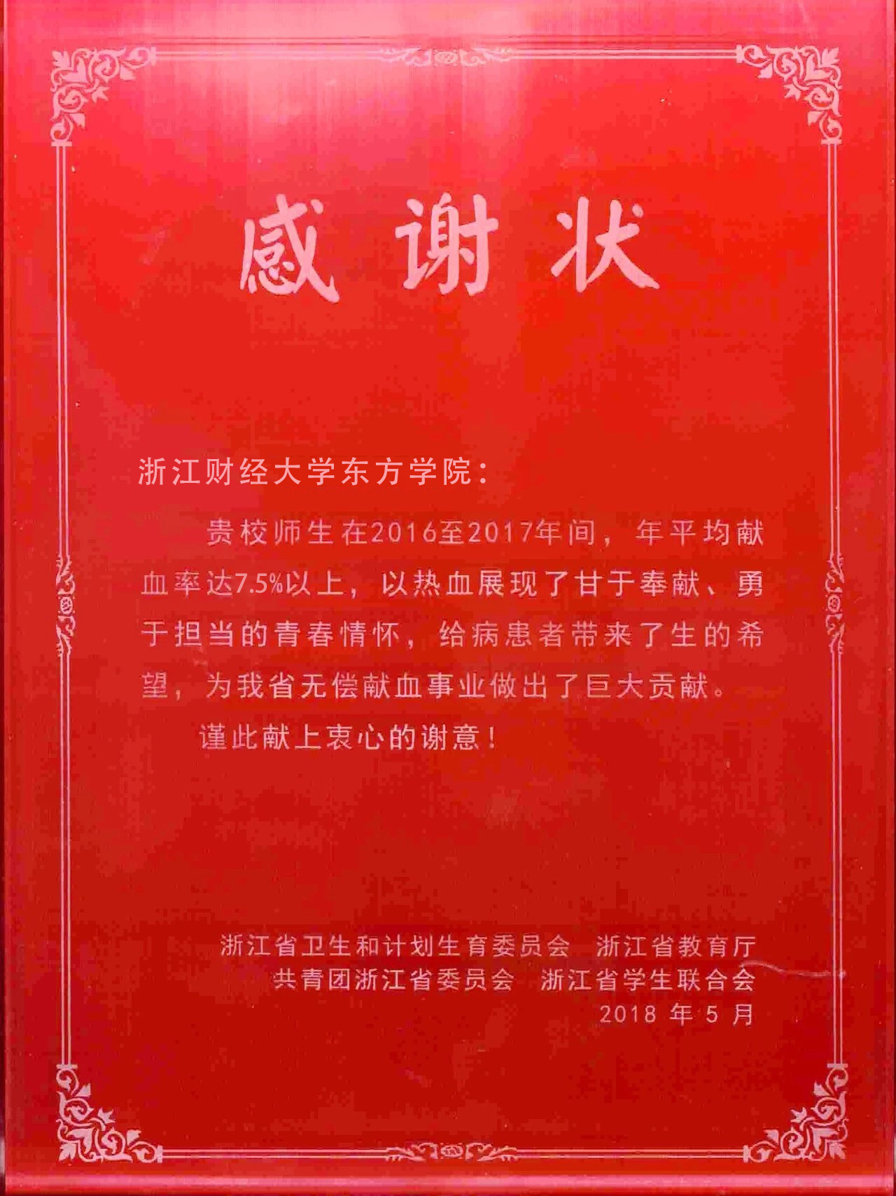 会上,我院受到通报表扬。据省献血中心统计,2016-2017年度我院年平均献血率达7.5%以上,在浙江省高校中名列前茅,我院被授予“浙江省高校无偿献血爱心集体”荣誉称号,毛沪倩同学被授予“浙江省高校无偿献血组织发动先进个人”荣誉称号。