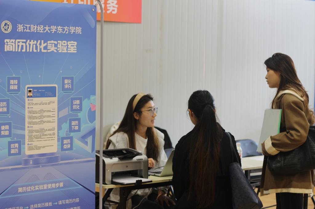 为提升人岗匹配度,给毕业生送上更精准、更全面的就业服务,在招聘会召开前,学院就业办面向全体2026届毕业生开展就业意向调研,根据学生意向就业类型,结合意向就业区域,点对点联系各地人社部门,邀请企业进校招聘。本次招聘会现场还集中设置特色服务板块,搭建就业“快车道”;“政策直通车”专区,由杭州市就业管理服务中心、海宁市人社局派专员入驻,现场为毕业生介绍就业政策,解答相关政策咨询问题;学院人武部联合长安镇人武部,开展征兵指导服务,为有入伍意向的毕业生提供政策咨询和指导;“简历优化实验室”根据AI智能诊断,为毕业生快速生成亮点突出的简历,精准捕捉每位毕业生的自身核心优势;云招聘面试间也为在场毕业生提供了实战演练机会,通过线上面试通道,学生“足不出户”即可完成简历投递和视频面试,牢牢把握求职机会。