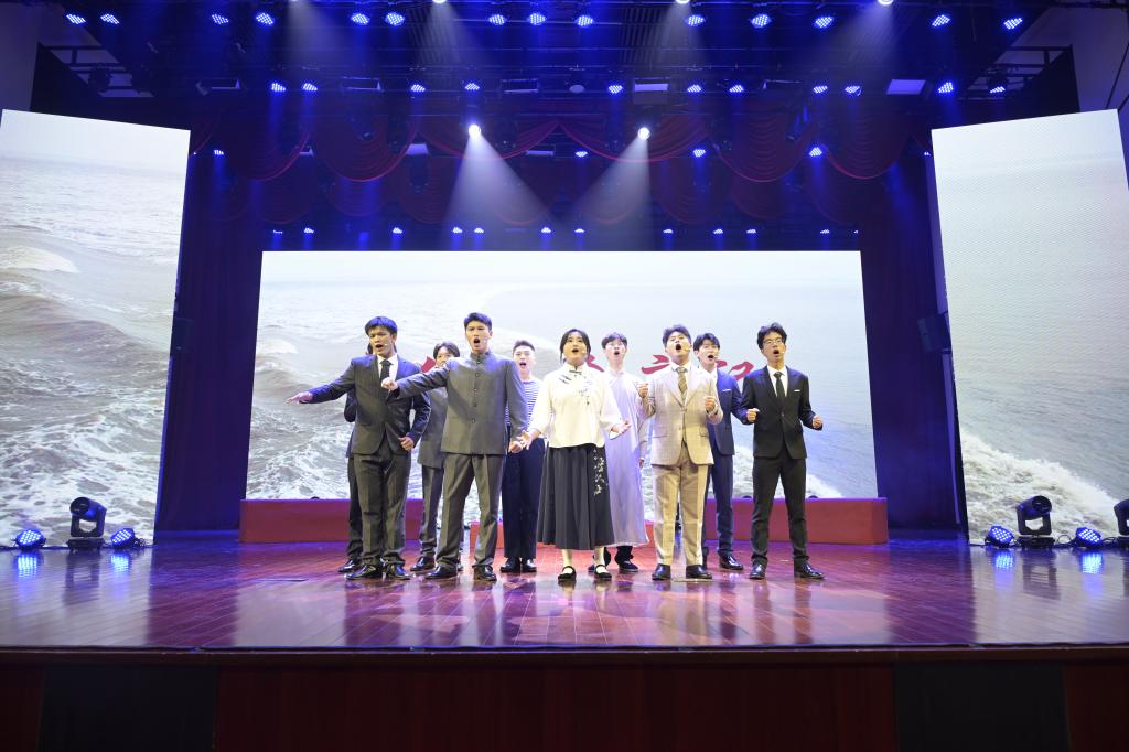学院马克思主义学院选送合唱《送别》作为开场节目拉开帷幕,瞬间将观众带回烽火连天的抗战岁月;以朱枫、王伟等十位浙江籍烈士为代表的朗诵《我们不会忘记》,生动再现了浙江抗战烈士们的英勇无畏。演出融合音乐、戏剧、朗诵等多元艺术形式,既有历史场景的深情复现,也有英烈精神的当代解读,现场官兵在光影交错中感受信仰力量,感悟“党旗所指、赤诚所向”的革命情怀。