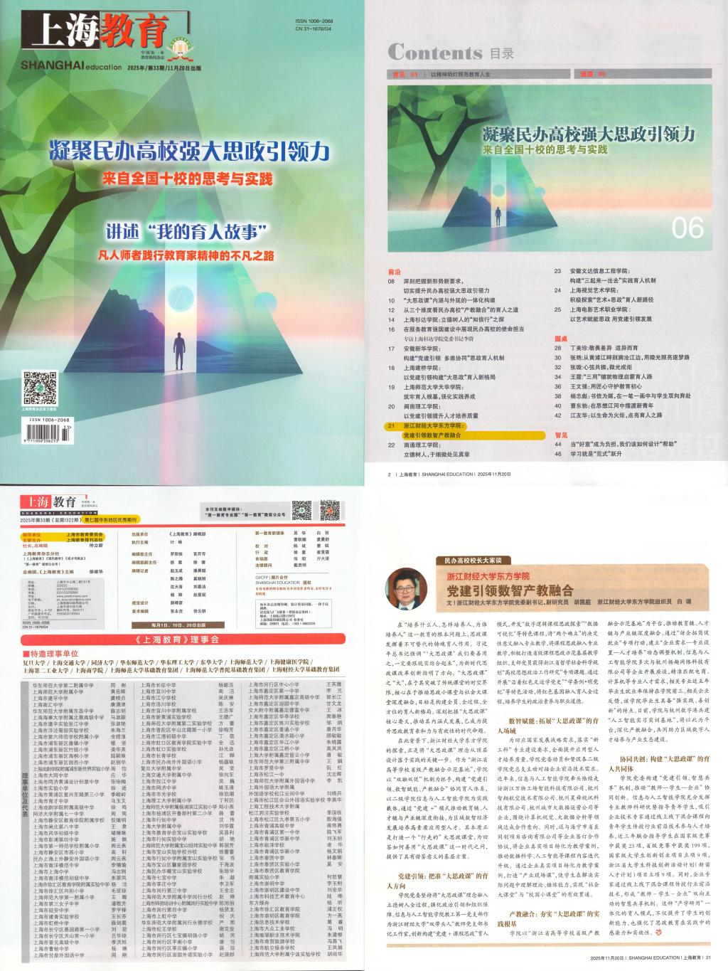 近日,由上海市教育委员会指导,上海教育报刊总社主管主办的《上海教育》2025年第33期刊登了学院党委副书记胡国庭等撰写的学院党建经验文章《浙江财经大学东方学院:党建引领数智产教融合》。