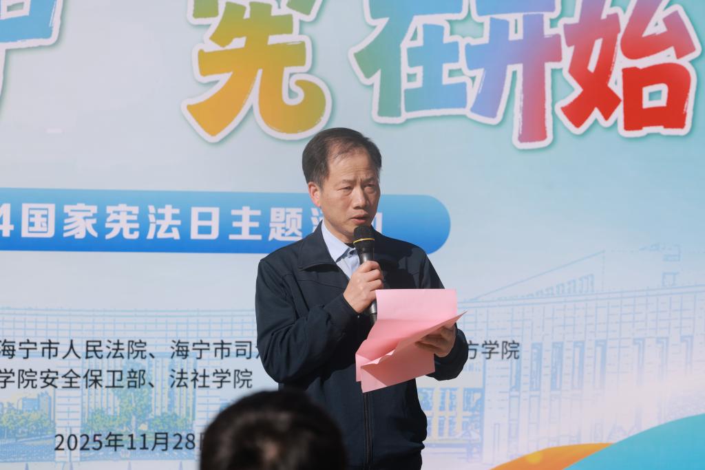 11月28日,由海宁市政法委、海宁市人民法院、海宁市司法局联合学院主办,安全保卫部、法社学院承办的“一生守护,‘宪’在开始”——12·4国家宪法日主题活动在学院小广场顺利举办。学院副院长张伟飚,海宁市法院审判委员会专职委员郭百顺,海宁市司法局党委委员、政治处主任王亮,海宁市委政法委平安综治督导室主任杜泽翼,组宣部、团委、科技部、安全保卫部、法社学院相关负责人,平安驿站站长等出席活动。