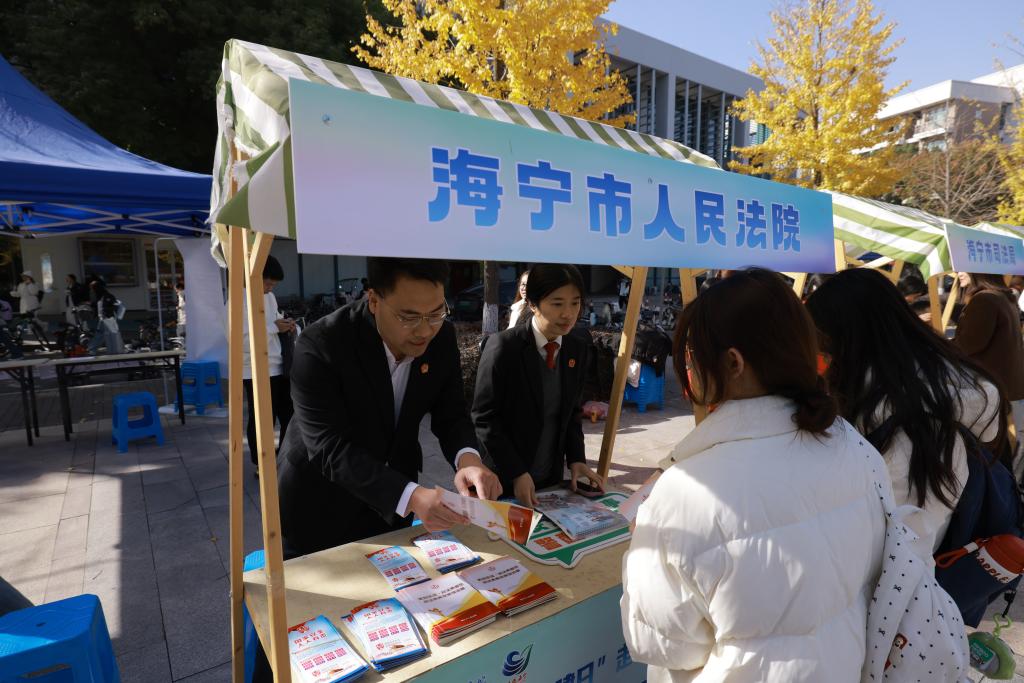 “平安集市”普法活动也吸引了大量师生参与。各普法单位通过宣传展板、手册发放、互动问答、反诈宣传等形式,为学生提供生动而实用的法治教育。