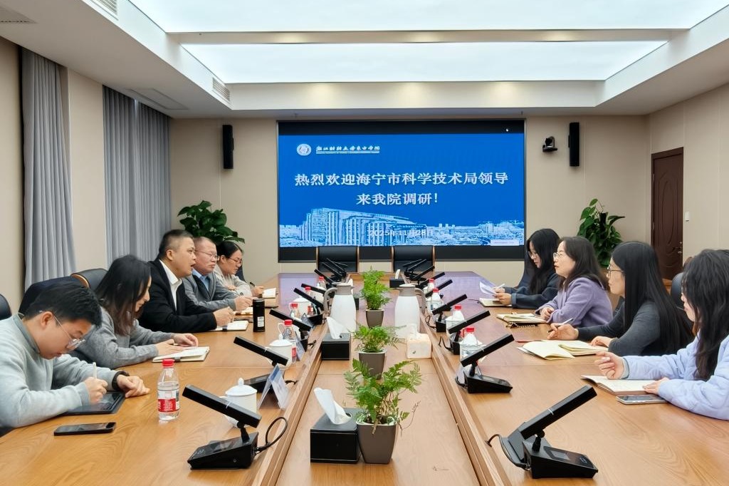11月28日,海宁市科学技术局党组书记朱锋率队来学院开展专题调研,学院学术副院长姚莉热情接待调研组一行。