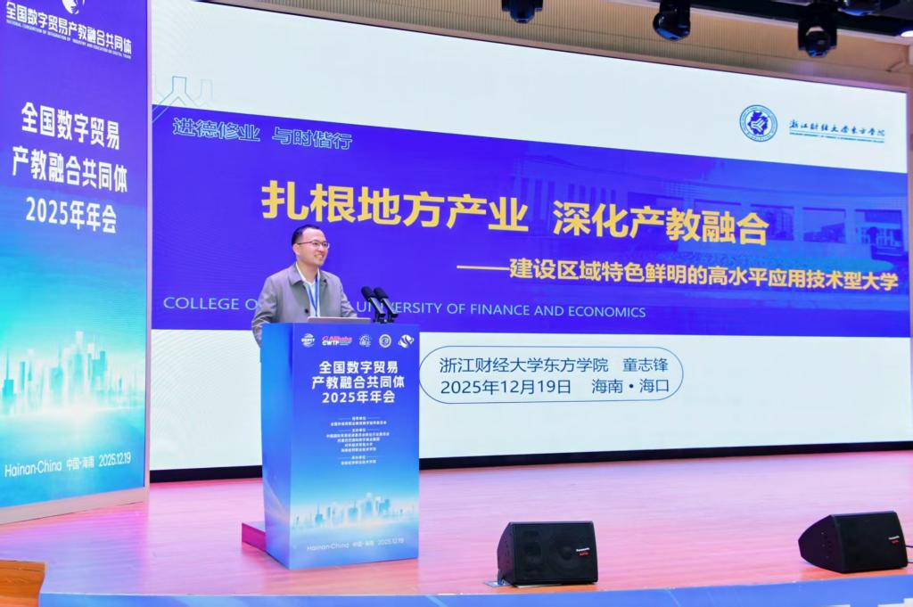 会上,童志锋作了题为《扎根地方产业,深化产教融合:建设区域特色鲜明的高水平应用技术型大学》的主题报告。报告紧扣服务国家现代产业体系与教育强国战略,系统介绍了学院在扎根地方产业优化专业布局、以创新战略引领协同机制建设、深化校企合作共绘数贸蓝图等方面的实践与探索。他强调,面对海南自贸港全岛封关运作的历史机遇,应用型高校应坚持产业需求导向,以共建机制为纽带,以数字技术为引擎,通过治理结构、课程体系和师资队伍的系统性改革,构建校企命运共同体,为数字贸易高质量发展提供坚实人才支撑。