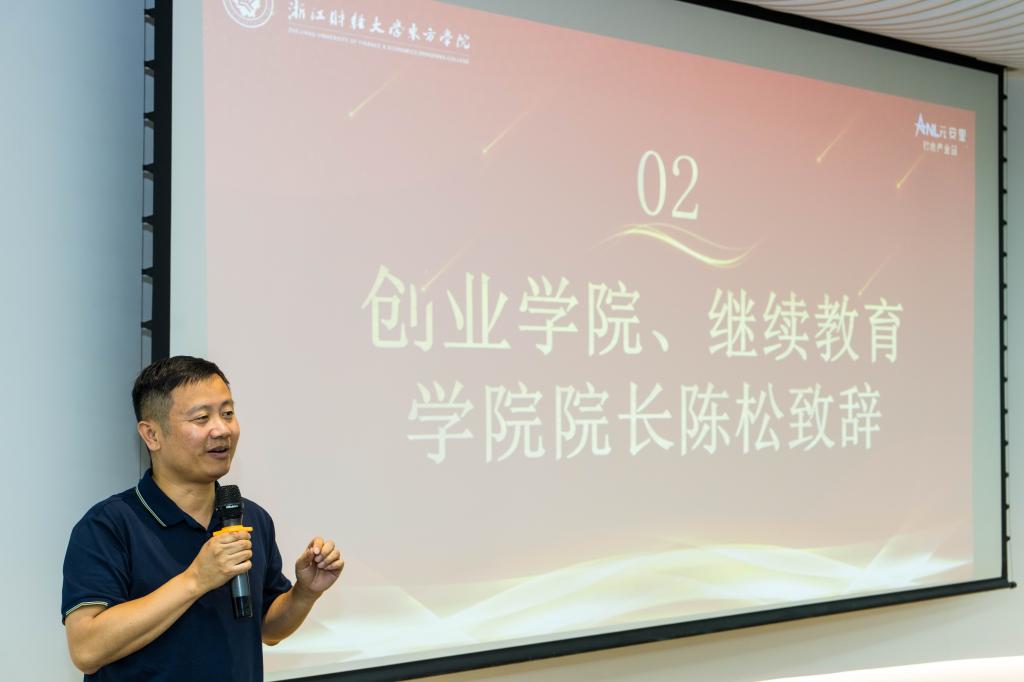 创业学院、继续教育学院院长陈松致辞。他首先对元安里时尚产业园给予直播电商创业微专业建设的支持表达感谢,接着祝贺第三届学员圆满结业,同时寄语第四届新生,要把握直播电商行业发展机遇,依托校企合作的产教融合平台,在实践中锤炼专业本领,成长为符合行业需求的优质人才。