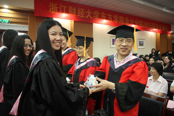 四年的时光,学校早已经变成了家。金融与经贸分院毕业生纷纷走上主席台,与教师代表合影留念,留下大学生活最感人的瞬间,表达对于老师和学院培养之情的深深感恩。会计分院全体教师通过视频的方式向毕业生表达了祝福,来自全世界各地的毕业生也通过视频祝贺2015届学生顺利毕业。毕业生代表们向老师行敬茶礼,以传统的礼节表达自己的感恩之心。“千里之行今朝起航”,外国语分院教师代表赵振春一首自己改编的诗歌《并非错》,向毕业生诉说“常回家看看”的心声。财税分院学生代表王康上台展示了分院的第一件院服,感动了在场所有师生。工商管理分院教师代表李馨弘希望同学们能继续学习,喜欢阅读,不断用时间完善自己。毕业生代表讲述了这四年来的经历与感触,1460多个日子,是他们共同拥有的青春,毕业,是结束,也是开始,他们会创造出精彩的,独一无二的未来!法政分院一则幽默风趣的相声《校园趣事》则让在场师生暂忘离别之苦,开怀一笑,为毕业典礼增添了一番不一样的风景。