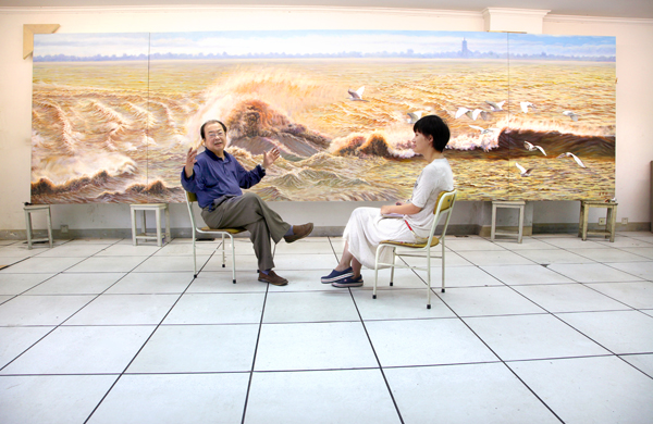今年6月在浙江财经学院文华老校区,老油画家原第二任校党委书记王先强每天拿着画板和画笔,认真仔细地在对一副大型油画进行最后的修饰和加工。该油画名为《逐浪钱江》,尺寸为190CM*660CM。油画气势磅礴,画面上的钱塘江波涛汹涌,12只不同体态白鹭迎着同一个方向坚定、有序、团结地博浪前行。