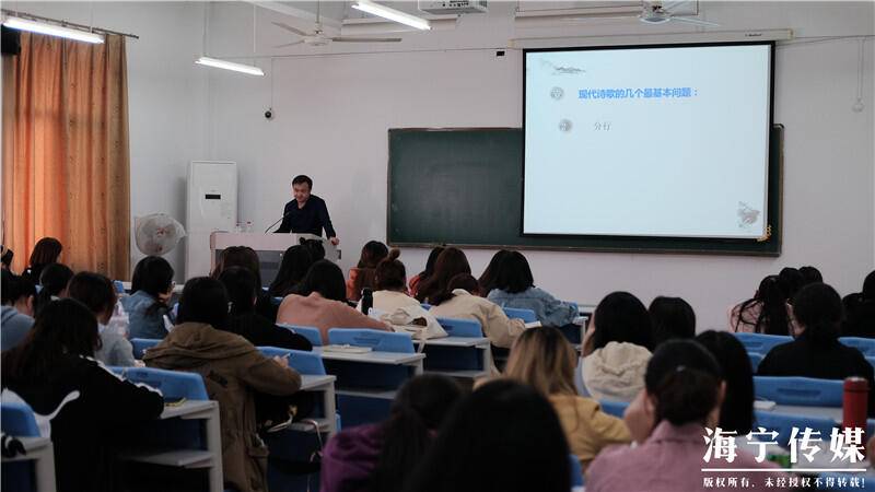 在活动中,海宁本地诗人汉江、傅震宇、王学海、任少云先后分享了自己在诗歌创作中的经验和感悟,诗人冬箫则为同学们上了一堂题为《现代诗歌的赏析与创作》的精彩课程,他结合作品和自己的创作体会,打开了诗歌爱好者们的思维。