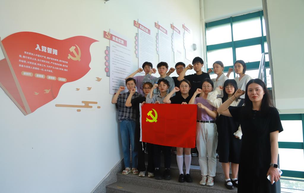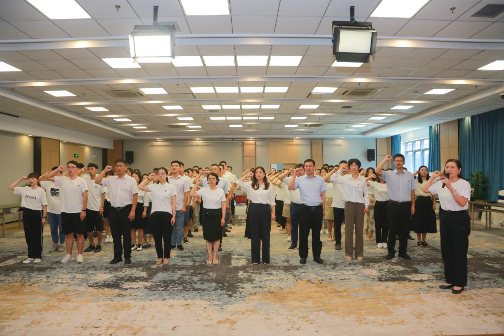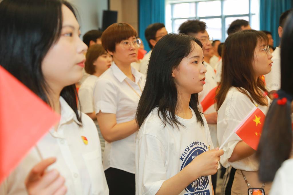 学院院长叶东恵领誓,全体党员干部庄严肃立,面对党旗,举起右拳,集体重温入党誓词,以最庄严的方式表达对党的热爱和祝福。