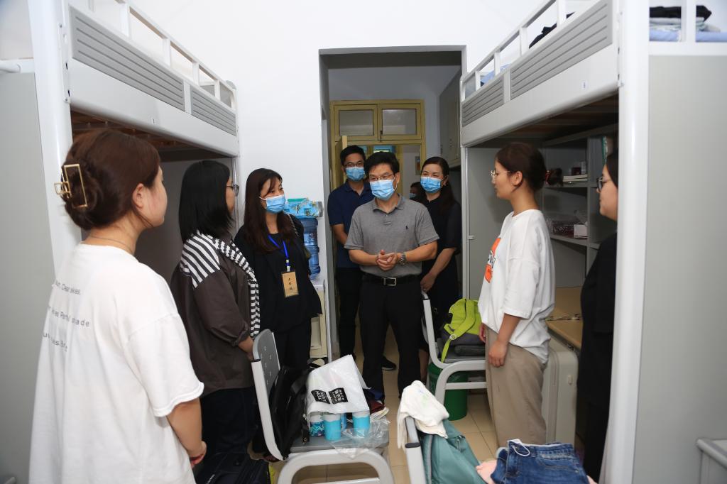 董进才一行深入了解学院迎新工作的整体安排,对迎新接待、氛围营造、后勤服务等方面表示肯定。董进才走进学院学生寝室,仔细询问新生住宿、防疫等生活情况。他鼓励刚刚入住宿舍的新生们:“学有所成,成为最好的自己。”在新生报到点,与新生及教职工亲切交谈,他表示,要做好新生始业教育,帮助他们尽早适应学校生活。