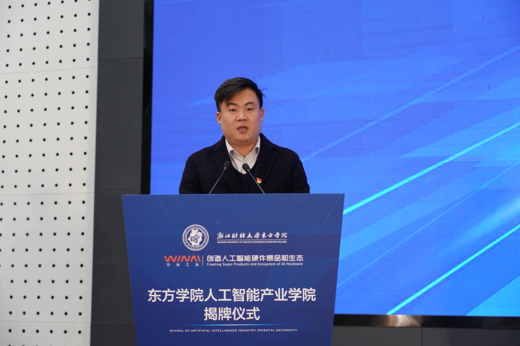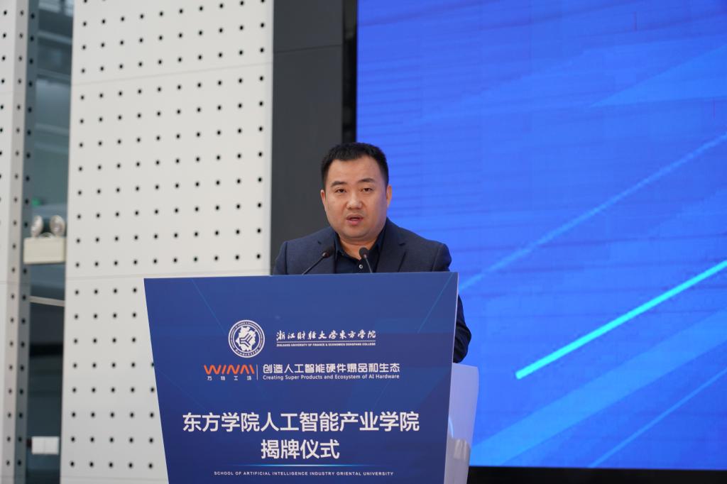 顾煜峰代表海宁经济开发区向产业学院的成立表达祝贺。他表示,在东方学院、万物工场、开发区以及各企业的通力合作下,共同建设好人工智能产业学院,努力构建产教融合、共同育人的“命运共同体”,共同解决招才难、育才难、留才难三大企业难关,最终可实现助力企业和开发区经济发展的目标。