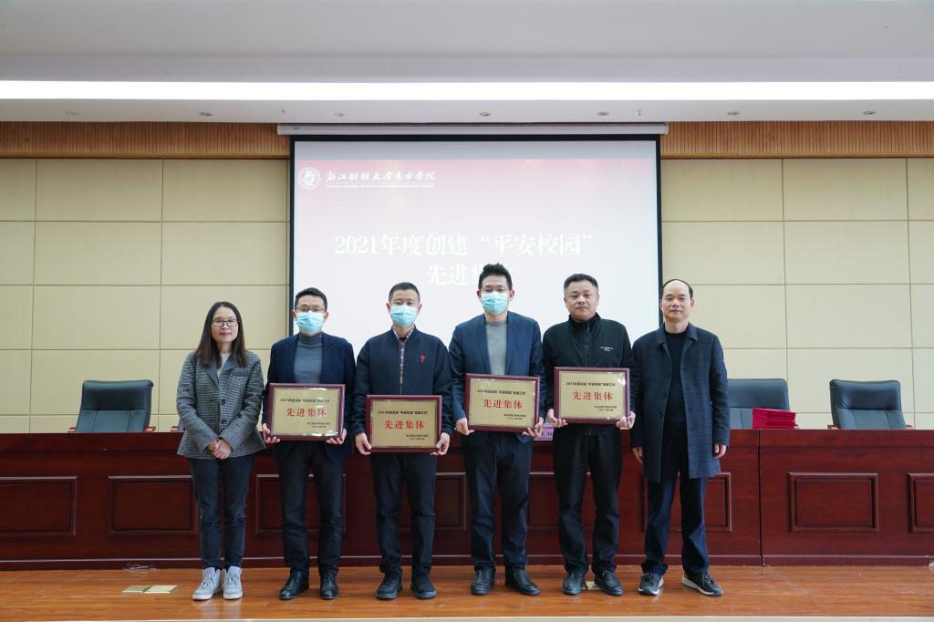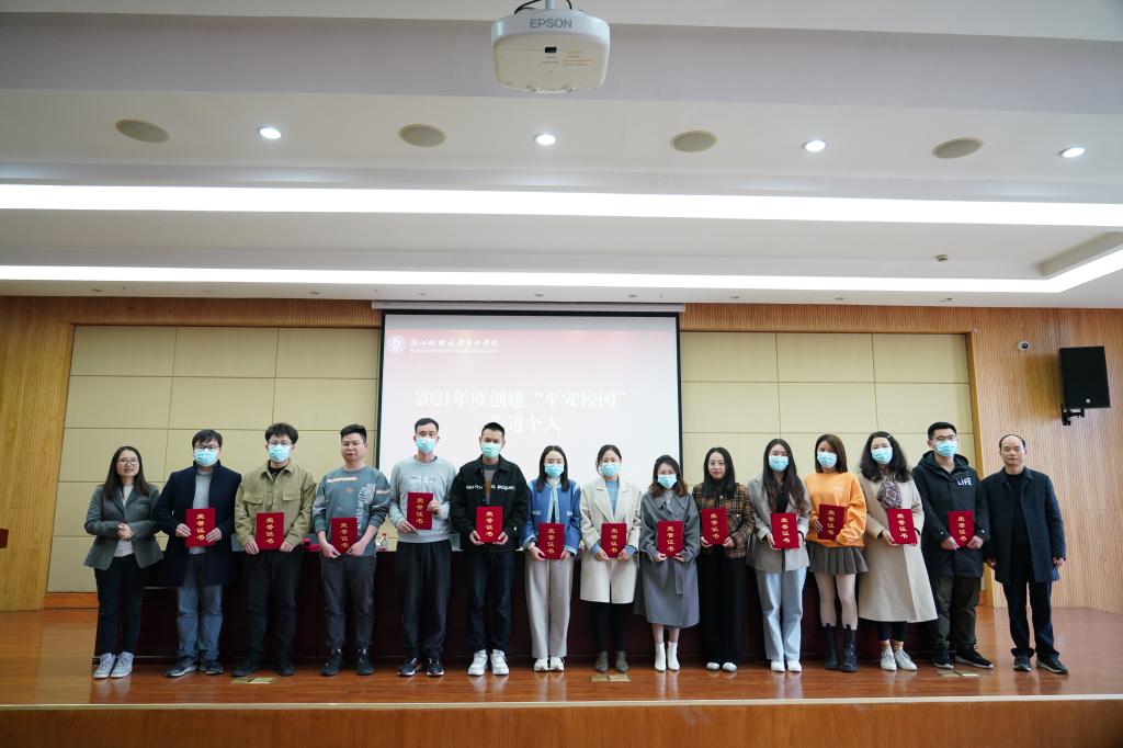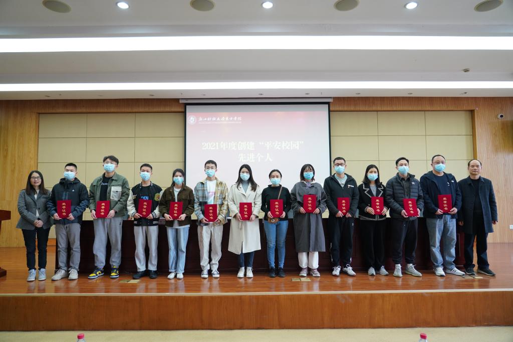 林香娥宣读了《关于表彰2021年度创建“平安校园”先进集体和个人的决定》,表彰了工商管理学院、外国语学院、党院办、信息技术部四个2021年度“平安校园”建设先进集体和鲁敏霞、钟慧慧等26位2021年度“平安校园”建设先进个人,并和蒋钰明共同给先进集体及个人颁奖。