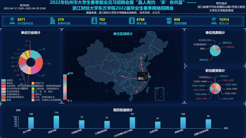 根据疫情防控要求,本次招聘会采用线上形式,招聘会持续到4月30日。4月12日当天,共有219家企业参会,提供岗位702个,学生投递简历近900份。参会企业涵盖金融、工业制造、服装、房地产、电商、物流、文化传媒等行业。毕业生通过线上投递简历、视频面试的方式与企业进行一对一交流,实现良好沟通。