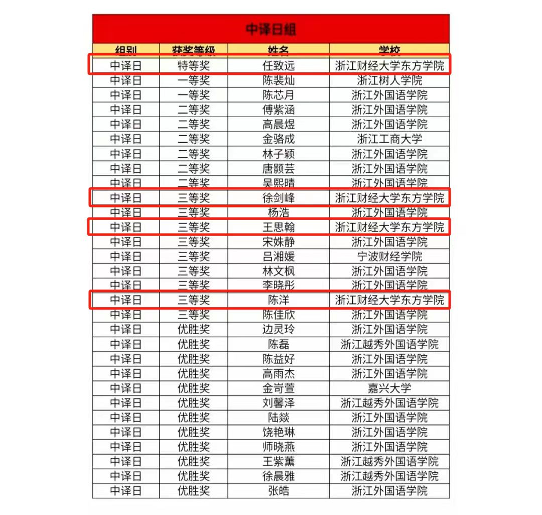 喜报!学院学子在浙江省第四届多语种思政笔译大赛中荣获佳绩 时间:2025-09-29来源:外国语学院 近日,浙江省第四届多语种思政笔译大赛圆满落幕,学院学子在此次比赛译日组中表现优异,其中任致远取得特等奖,徐剑峰、王思翰、陈洋获得三等奖。 本次大赛由浙江外国语学院与浙江省外文学会联合举办,设立了多个本科组别,共有来自13所高校的412余名在校本科生报名参赛。比赛旨在培养新时代国际传播人才,推进习近平新时代中国特色社会主义思想融入外语教学研究和人才培养全过程。 学院将继续致力于培养高素质的外语人才,推动外语教学与思政教育的深度融合,为“文化出海”贡献力量。(文:逢明杰) 上一篇:胡国庭副书记带队参加海宁盐官服务月活动 下一篇:申屠莉书记走访慰问受资助学生 【关闭】